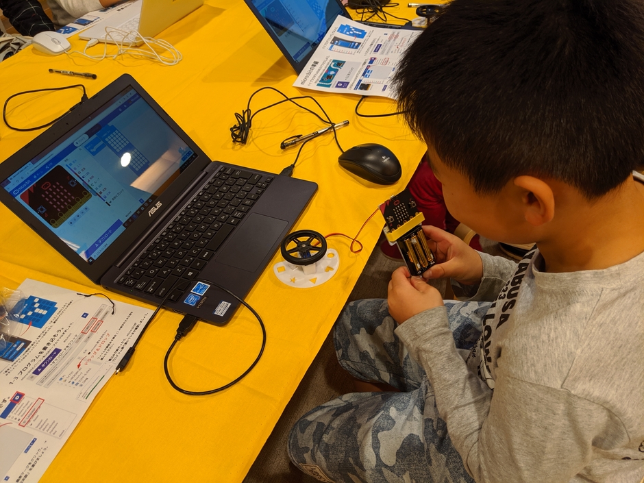 スイッチエデュケーションでは、micro:bit(マイクロビット)とmicro:bit用ワークショップモジュールを使ったさまざまなワークショップを、神楽坂にあるBOOK&OFFICE 文悠にて定期的に開催しており、定員6人に対しスタッフ3人でサポートするため、プログラミング初挑戦のお子さんも楽しく取り組めます。