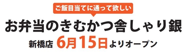 東京、神奈川を中心に飲食店経営を行う株式会社きむかつ舎(神奈川県横浜市)は、東京都港区新橋に弁当専門店「お弁当のきむかつ舎しやり銀」を 2020 年 6 月 15 日(月)よりグランドオープン致しました。