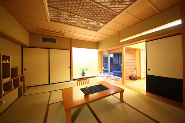 5人の若手工芸作家からなる「シマネRプロダクト」とコラボして作った「出雲匠の間」。出雲鍛造、石州和紙、組子細工など、伝統の技と新しい感性が光る作品の数々が室内を彩ります。あたたかさを演出するのは、ユネスコ無形文化遺産にも登録されている石州和紙で作られた襖と障子。そこに何種類もの細かな木片を組み上げて模様を描く組子細工の天井照明と、出雲鍛造で造られた情緒あふれる燭台や行灯が、優しい光を放ちます。