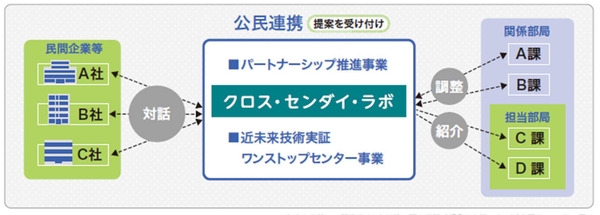 仙台市では、民間企業等が有するノウハウ、アイデア等を活用して、複雑化・多様化する行政課題・地域課題の解決等を促進する民間企業等との連携窓口「クロス・センダイ・ラボ」をまちづくり政策局プロジェクト推進課内にオープンしました。