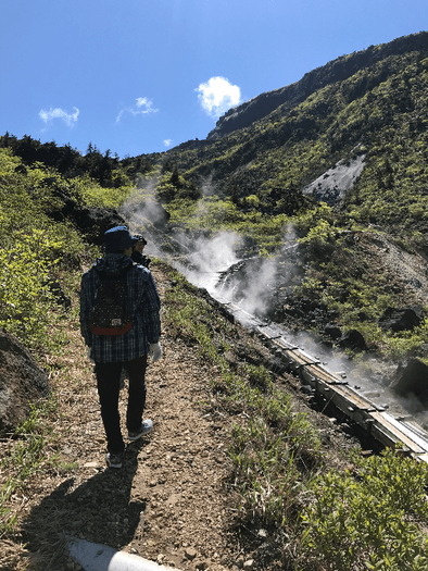 源泉まではちょっとしたトレッキング。登山にふさわしい服装と装備品が必要です。