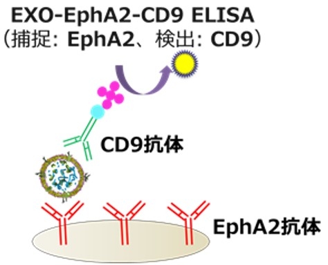 現在、尿中エクソソームの主要な回収法は超遠心法とされていますが、高額な機械(超遠心機)を必要とし、時間もかかることから、臨床現場での使用は現実的ではありません。そこで、研究チームは臨床応用可能な測定系の開発を行うべく、エクソソームの回収にPSアフィニティー法を採用しました。これは、エクソソーム膜面のホスファチジルセリンに結合するTim4タンパクを利用した技術で、高純度なエクソソームを短時間で回収することが可能です(商品名:MagCapture™ Exosome Isolation Kit PS Ver.2)。研究チームは、PSアフィニティー法により尿5mlからエクソソームを回収し、プレートに固体化したEphA2抗体でEphA2陽性エクソソームを捕捉し、エクソソームの表面マーカーであるCD9に対する抗体でエクソソームを検出するELISA法による測定系(EXO-EphA2-CD9 ELISA)を開発しました(下図)。