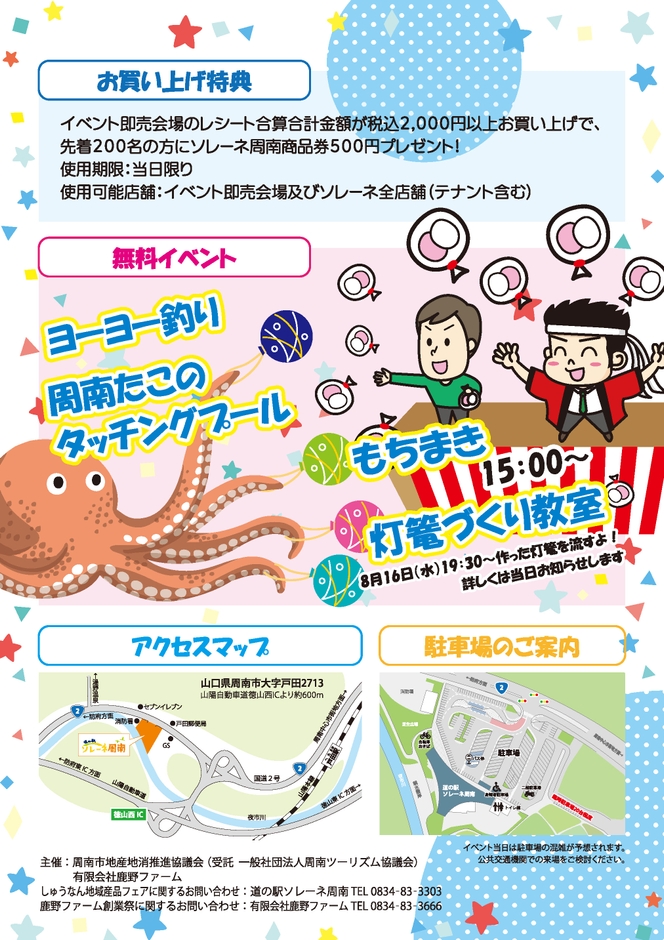 「しゅうなんブランド」認定品をはじめとする特産品の販売や、周南たこのタッチングプール、ヨーヨー釣り、灯篭づくり教室、もちまき等、盛りだくさんのイベントです。
