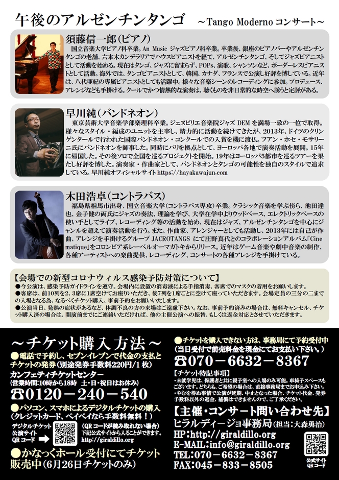 ヒラルディージョ事務局(神奈川県横浜市)、~Tango Moderno コンサート~『午後のアルゼンチンタンゴ』が2022年6月26日 (日)に横浜市神奈川区民文化センター かなっくホール(神奈川県横浜市)にて開催されます。チケットはカンフェティ(運営:ロングランプランニング株式会社、東京都新宿区、代表取締役:榑松 大剛)にて発売中です。