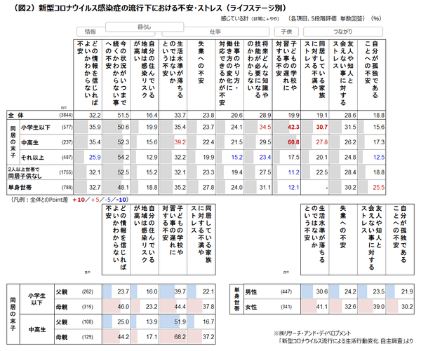 末子中高生/小学生以下の世帯の不安やストレスについては「同居家族に対する不満やストレス」を感じる人が3割と多め。父親より母親の方が不満・ストレスを感じる人が多く4割にのぼる。また、「子供の学校や習い事の遅れに対する不安」を感じる割合も高く、末子中高生の世帯では6割と半数を超える。特に母親では7割近くが不安に感じている。