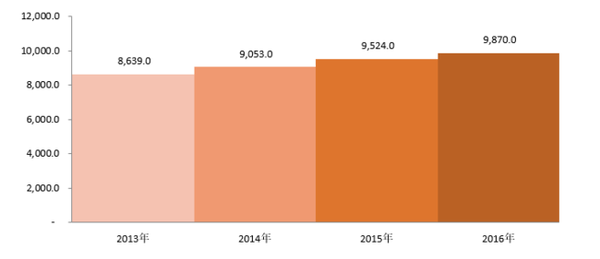 一人当たりの米国医療費、(USD)、2013ー2016年
