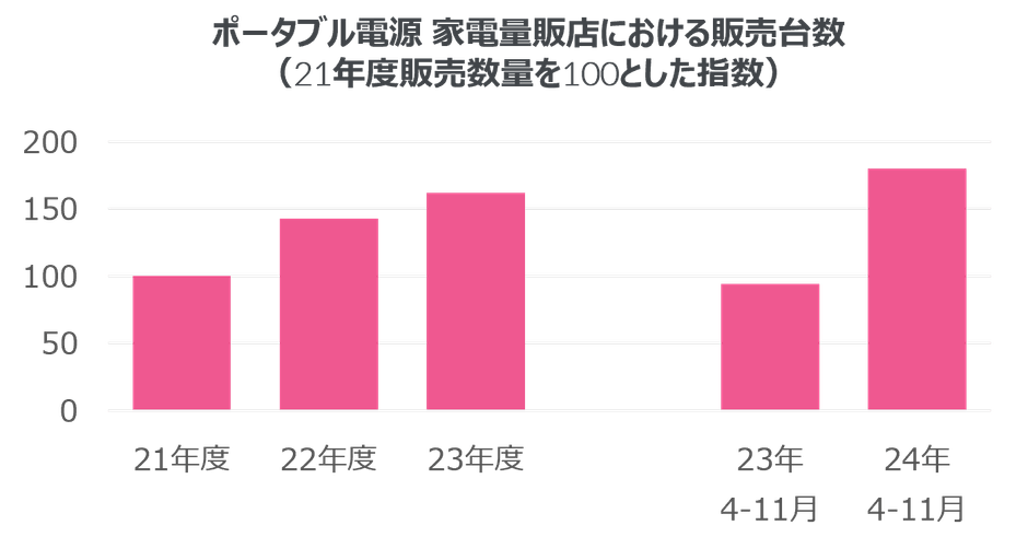 日本は地震や台風などの自然災害が多く、その影響で停電が発生するケースも多い。このような非常時にスマートフォンや家電製品に給電できるポータブル電源の需要が高まっている。家電量販店における2024年4~11月の販売数量は前年同期比90%増と、約2倍に成長した。