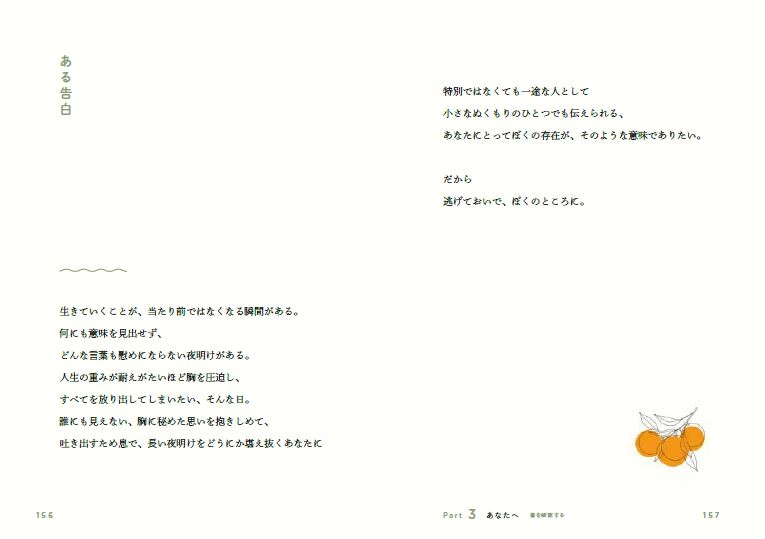 だから著者は、矛盾する気持ちも含めてすべての事実を受け入れ、まわりを見渡す。隅っこに押しやりたいけど、限りなく近づきたい存在。ときには自分を痛みの中に押し込めたりもするけど、生きる理由を与えてくれることもある存在。そんな存在をいちばん温かいまなざしで眺める練習をします。