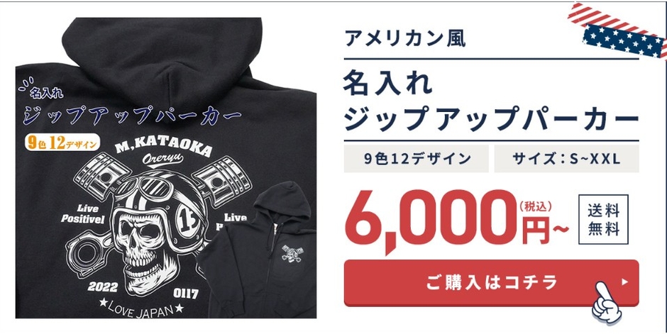 【全品10%OFF】名前や日付カスタム可能のアメリカンデザインセール!スカル、バイクなど12種類 – 12/10(火)開催!パーカーやタオルなど種類豊富