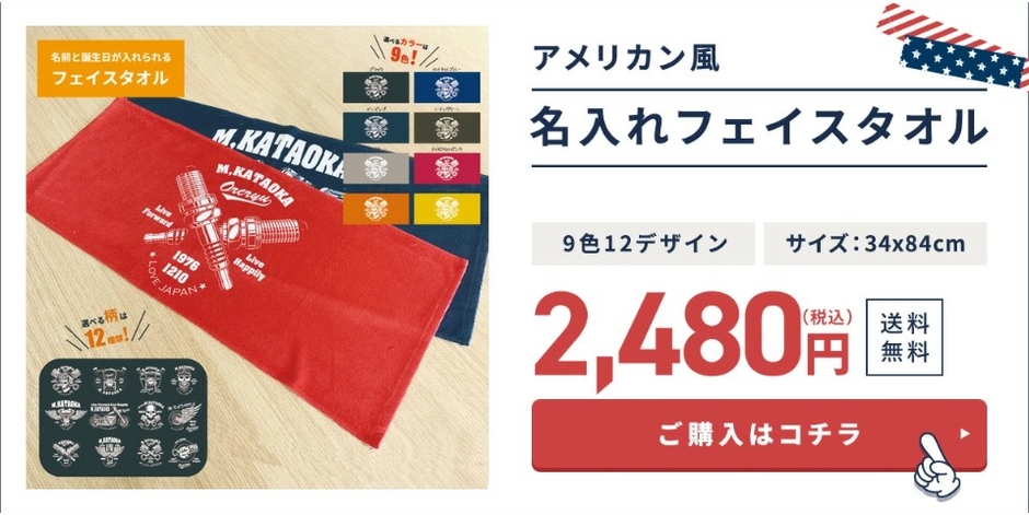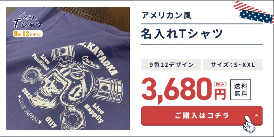 アメリカンシリーズは、カスタマイズ可能なデザインが特徴のラインナップです。デザインはバイクやエンジン、ピストンなど、アメリカンカルチャーにインスパイアされた力強いモチーフが揃っています。これらのデザインにお名前や日付を入れることができ、オリジナルのTシャツ、パーカー、タオルなどを作成できます。アメリカンスタイルのクールなアイテムで、個性を表現できるだけでなく、特別なギフトとしても喜ばれること間違いなしです。
