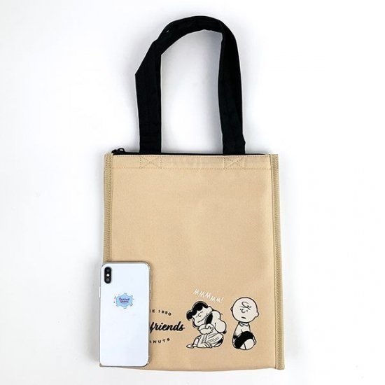 Lサイズをスマホと比較しています♪ベージュのカラーのバッグには、抱っこされるスヌーピーのほっこりデザインが描かれていますよ♡持ち手はブラックなので、バイカラーで楽しめます。