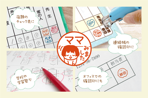 2023年1月に販売開始した「みましたスタンプ」。お子さまの連絡帳や音読カードのサイン、塾や学校の先生が提出物に押す確認印に使える、かわいいイラスト入り印鑑です。回覧板のサインやオフィスでのチェック印などにもオススメです。
