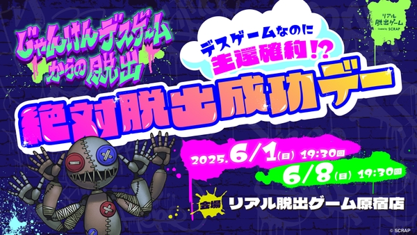 全世界で累計1,490万人以上を動員しているリアル脱出ゲームを企画制作する株式会社SCRAP(本社:東京都渋谷区、代表:加藤隆生)は、現在東京にて好評開催中の新作リアル脱出ゲーム『じゃんけんデスゲームからの脱出』にて、リアル脱出ゲームをより気軽に参加できるようになる特別施策「絶対脱出成功デー」の実施と「お試し謎」の公開を発表いたします。