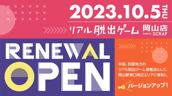 株式会社SCRAP(所在地:東京都渋谷区、代表者:加藤隆生)は、本日2023年10月5日(木)より「リアル脱出ゲーム岡山店」を移転しリニューアルオープンいたします。
