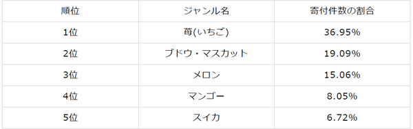 2019年ふるさと納税の人気カテゴリ別寄付件数ランキング第3位の「果物・フルーツ」の内訳は次のとおりとなりました。