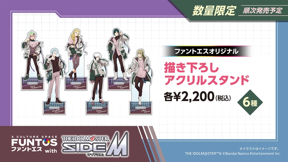 コラボ期間中、「彩」「Legenders」の6人のファントエスオリジナル衣装でのファッション撮影をテーマに、オリジナル描き下ろしイラストおよび描き起こしミニキャライラストを使用したグッズや事務所風ブロックカレンダーなどのオリジナルグッズを販売予定です。