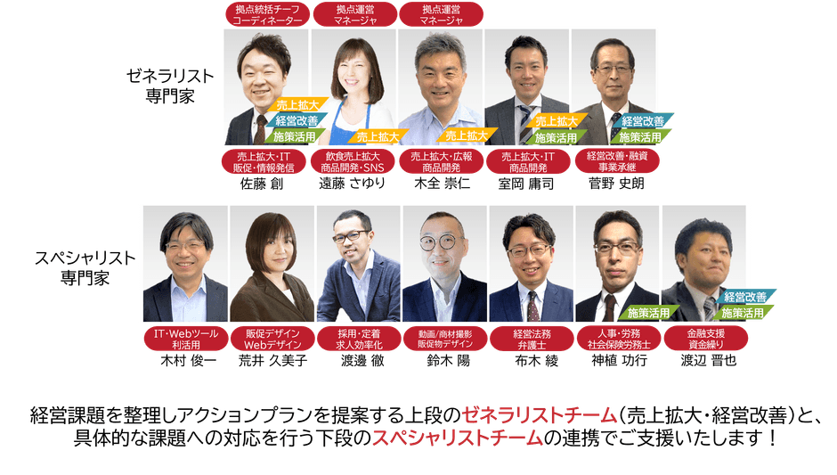 経営相談を行うコーディネーターは現在12名が在籍(下図参照)。中小企業診断士など経営全般の相談を承る人材から、デザインやIT・フードメニュー開発など専門領域に特化した課題解決ができる人材まで多様な支援者がチームとなって支援を行っています。
