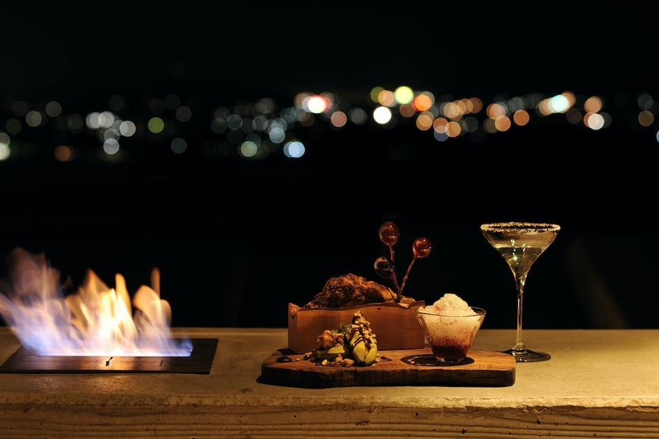 アクティブな一日の終わりには、キャビンで夏の夜をゆっくりと過ごすディジェスティフ(食後酒)を用意します。星のや富士のシェフ監修の、ワインを使ったブドウ飴や、数種類のスパイスを効かせたシロップのかき氷、ウイスキーが香るクリームを合わせたチョコバナナといった、夏祭りの夜を彷彿させるスイーツが並びます。ラムネをイメージした、炭酸の泡が心地よい食後酒を合わせて楽しみます。広々としたテラスリビングで、河口湖の夜の涼しい風を感じて夜景を眺めながら、童心にかえって夏の夜を過ごします。