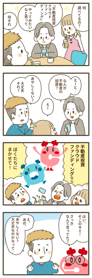 マンガでわかる!不動産クラウドファンディングについてCOZUCHIオリジナルマスコットキャラクターが解説しています。