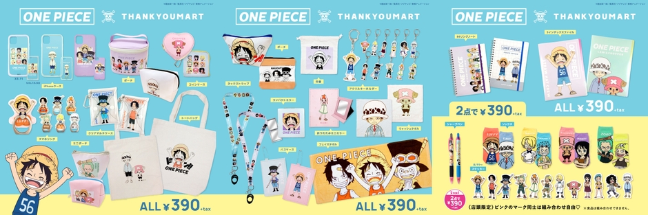 全品390円+taxのサンキューマートに、大人気アニメ「ワンピース」の限定描き下ろしグッズが新登場! 8月8日(土)より全国のサンキューマートにて発売いたします!