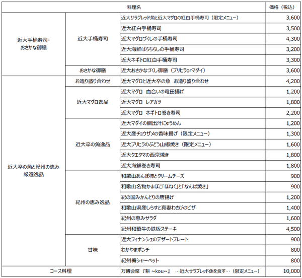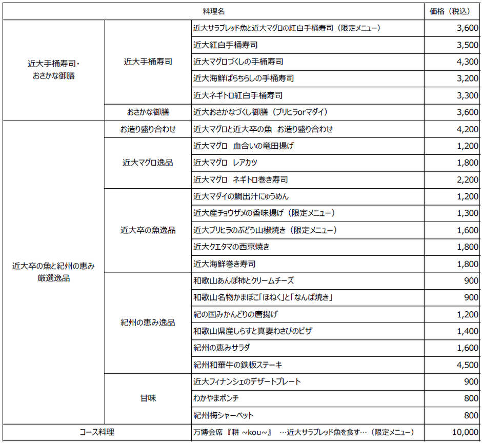 【近大卒の魚と紀州の恵み 近畿大学水産研究所 大阪・関西万博 ウォータープラザ店 提供メニュー一覧】