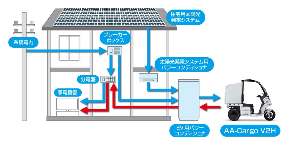 「AA-Cargo」に、V2H機能(車載の電池に貯めた電気を外部に供給するシステム)を付加したモデル。車載のバッテリーにためた電気を、自宅でも使用できるようになります。8kWhのバッテリーをフル充電すれば、一般家庭の約一日分の電気を供給可能。災害などによる万が一の停電時にも、確実なライフラインとして役立ちます。また「移動できる電源」として、屋外での使用も可能。大自然の中でも不自由なく電気を使える快適なキャンプなど、新しいカタチのレジャーも楽しめます。CHAdeMOソケットを装備することで、屋外施設などでの急速充電にも対応しています。