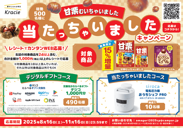 クラシエ株式会社(フーズカンパニー)は、ロングセラー商品「甘栗むいちゃいました」シリーズより、「甘栗むいちゃいました35g」「甘栗むいちゃいました70g」の内容量を15%増量した期間限定パッケージを2025年8月4日(月)より全国のスーパーマーケット・ドラッグストア・コンビニエンスストアなどで発売いたします。また本商品を含む対象商品を購入した方を対象に、豪華賞品が当たるキャンペーンも開催予定です。