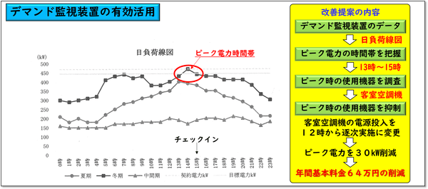 不必要な時間と場所でエネルギーが浪費されていないかを発見し、スタッフ一人一人が考えて日々の業務を改善できる体制になりました(食器洗浄の仕方、調理の仕方、空調機の温度調整の仕方、照明の点灯消灯の仕方など)。特に、ゆづくしSalon一の坊では、デマンド監視装置の有効利用により、基本料金年間 64 万円を削減しました。