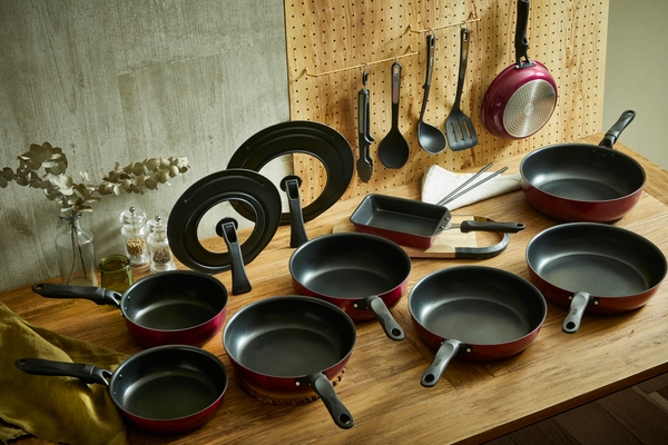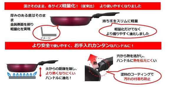 この度のリニューアルでは、フライパンの軽量化を実現(従来比)。また、ハンドル部分が進化し、よりスリムな形状になって握りやすくなっただけでなく、ハンドルに熱を伝えにくい設計に変更。コーティングも施しているため汚れの付着を防止し、洗いやすさにも配慮するなど、細部までこだわった仕上がりになっています。