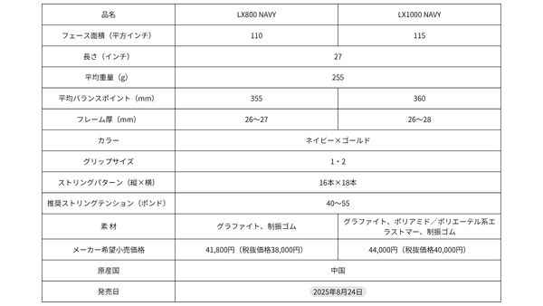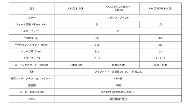 住友ゴムグループの(株)ダンロップスポーツマーケティングは、ダンロップテニスラケット「CX」シリーズ3機種(「CX200 BLACK」「CX200 18×20 BLACK」「CX400 TOUR BLACK」)と、「LX」シリーズ2機種(「LX800 NAVY」「LX1000 NAVY」)の数量限定デザインを2025年8月24日から販売します。