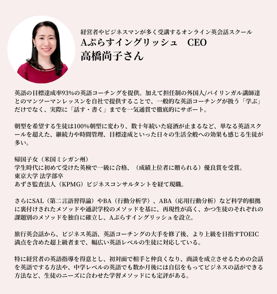 そこで今回は、経営者やビジネスマン向けの英語指導を得意とするオンライン英会話スクール「Aぷらすイングリッシュ」の CEOで、東大卒&帰国子女、予約2ヶ月待ちの人気英語コンサルタントとして活躍する高橋尚子さんに、日本人が誤解している英語コミュニケーションと、本当にビジネスで使える英語を身につけるための英会話習得法について聞いた。