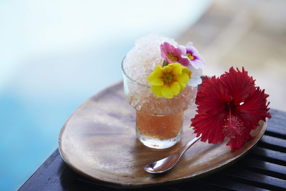 海を臨む「BOOKS&CAFE」では、島で親しまれているフルーツのひとつ、グアバを使用したオリジナルかき氷を提供します。甘酸っぱい味わいのグアバを使ったかき氷に、エディブルフラワーを添えた見た目もかわいい「お花かき氷」です。オーシャンフロントの特等席で、ひんやりスイーツを食べながら、くつろげます。
