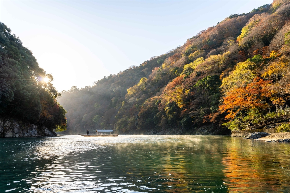 朝日に照らされる大堰川で舟遊び「朝のもみじ舟」