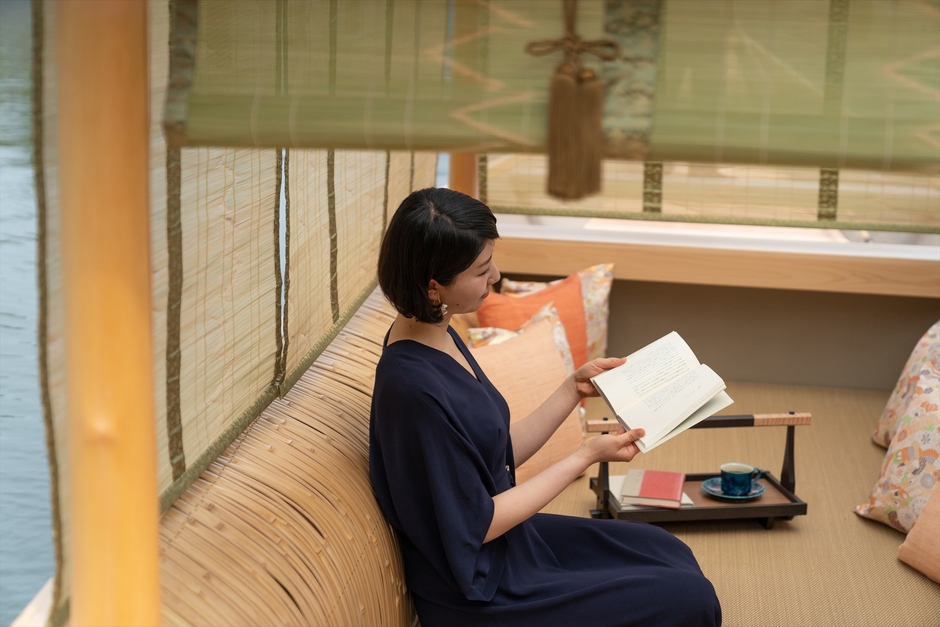 京都の伝統工芸に囲まれる雅な空間で、御簾(みす)越しに嵐山の風景を眺めながら、平安絵巻さながらの優雅な時間を過ごすことができるようデザインしました。大堰川では平安時代より和歌や管弦楽に興じながら四季の風景を愛でる舟遊びが行われていました*1。江戸時代以降の絵画にも舟の上から景色を楽しむ人々の様子が残されており、渓谷の美しさは現在もほぼ変わらないと言われています*2。その歴史風情ある景観になじむよう、翡翠には京都で古くから親しまれてきた建材や装飾を用いています。