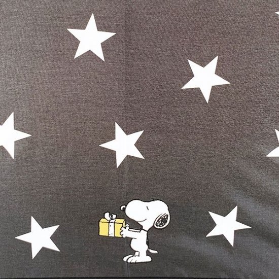 デザイン違いには、ブラックカラーにホワイトの星模様☆こちらもさらにクールな印象です。もちろん、スヌーピーもいますよ♪こちらのスヌーピーは、プレゼントを持ってニッコリしています。