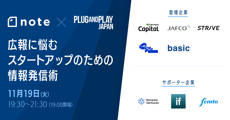 noteはシリコンバレー発のアクセラレーター・Plug and Play Japanと共催で「広報に悩む スタートアップのための情報発信術」を11月19日(火)19時半から、noteを運営するピースオブケイクのイベントホール(東京都港区)で開催します。本イベントは、一定の条件を満たしたスタートアップ企業が1年間無料でnote proを利用できる「note proスタートアップ応援プログラム」のパートナー各社(インキュベイトファンド、サイバーエージェント・キャピタル、 ジェネシア・ベンチャーズ、JAFCO、STRIVE、D4V、フェムトパートナーズ)に登壇やサポートをしていただきます。