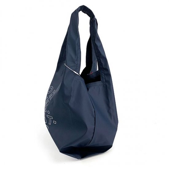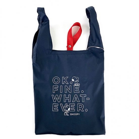 ネイビーに文字とスヌーピーがデザインされた、シンプルなエコバッグが登場です。ベーシックなカラーとともに形も汎用性のあるフォルム。ヒモの赤が効いていて、さりげなくオシャレなマルシェバッグです。