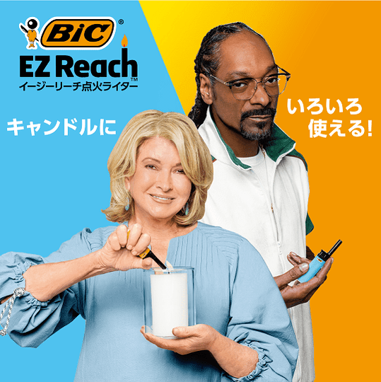 「イージーリーチ点火ライター」の世界共通アンバサダーとして、エンターテインメントのレジェンドである、“スヌープ・ドッグ”さんと、 ライフスタイルイノベーターとして活躍の“マーサ・スチュワート”さんを採用しました。お二人は料理番組やセレブリティゲストへの おもてなし、さらには料理本など、多くのプロジェクトで一緒に コラボレーションしています。