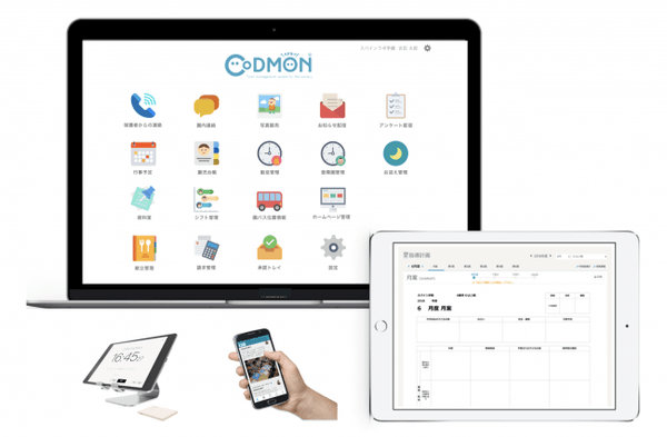 「CoDMON」は園長や保育士の日々の業務負担軽減を目的とした、保育業務支援システムです。ICT化によって指導案や日誌の作成、園児毎の登降園管理や保育料計算、請求管理、さらには保護者連絡まで、一貫してサポートしています。