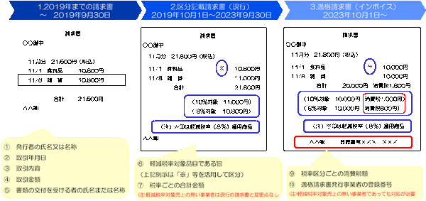 現行の「区分記載請求書」に「登録番号」、「適用税率」及び「消費税額等」の記載が追加された書類やデータをインボイスといいます。