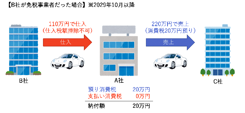 先ほどの例で表すと2029年10月以降、B社が免税事業者だった場合は下記のように10万円の仕入税額控除ができず、A社の納付額としては20万円となります。