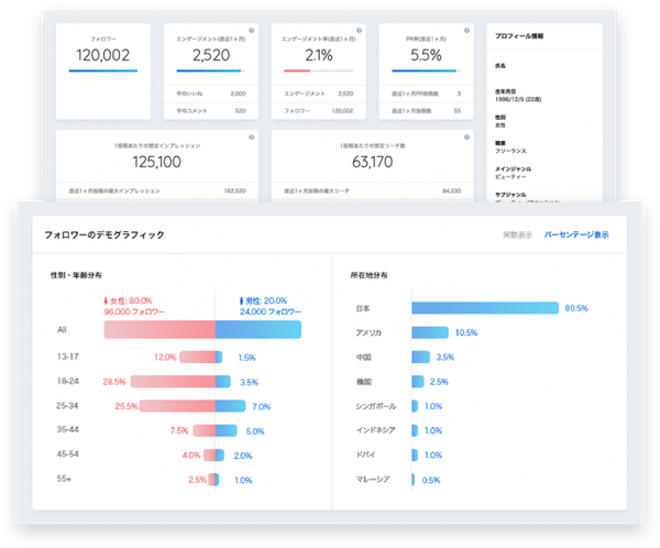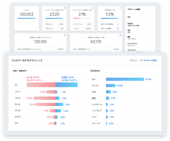 REECHは、フォロワー数や雰囲気に頼った従来のキャスティングとは異なり、フォロワーの男女比、年齢分布、所在地分布、エンゲージメント数、インプレッション数、リーチ数等の実際の数値に基づいた根拠のあるキャスティングを行えるプラットフォームです。