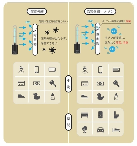 除菌プロ業者も使用するオゾンを発生!紫外線+オゾンのダブル除菌で死角にも対応!