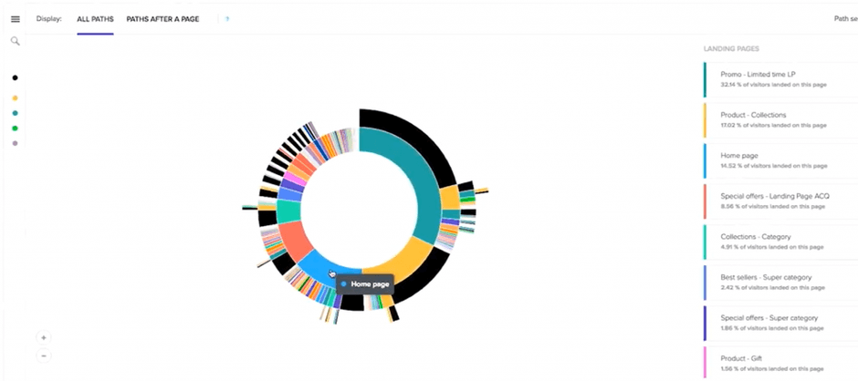 ▼Contentsquareカスタマージャーニー分析画面(ページごとの遷移率、離脱率を一目で把握することができる機能)