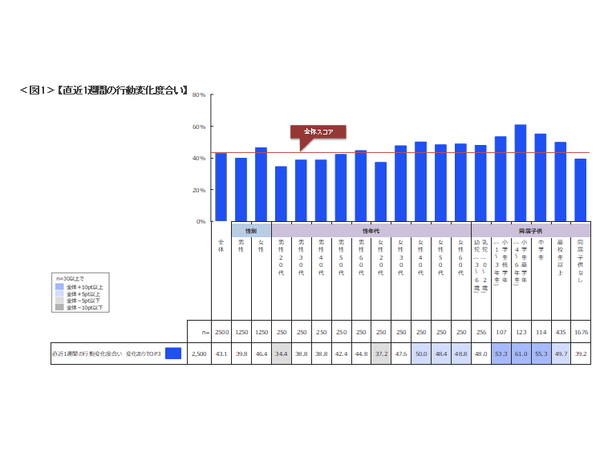 【直近1週間の生活習慣の変化(新型コロナウイルス流行前と比べて変わったか)】についての質問では、全体の約1割が「非常に変わった」と回答。なんらか変化ありと回答した方は、全体で43.1%、男性39.8%、女性46.4%と女性の方が男性を上回っている。年代別には男女とも年齢が上の方で変化を感じる人が多いが、女性では30~40代でも5割が変化を感じている。また小学生・中学生をお持ちの方がより変化を感じている。<図1>直近1週間の「不安度」を聞いた質問でも女性30代が最も不安を感じていると答えており、全国一斉休校になった影響が考えられる。