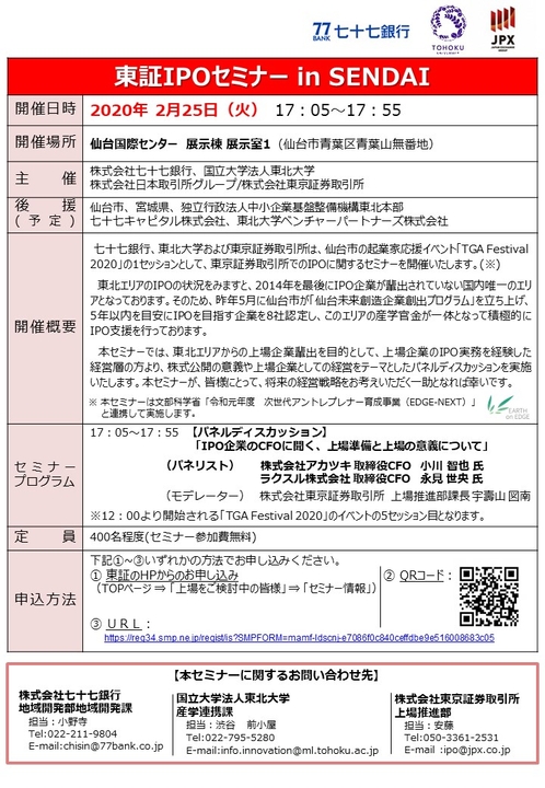 七十七銀行、東北大学および東京証券取引所は、仙台市の起業家応援イベント「TGA Festival 2020」の1セッションとして、東京証券取引所でのIPOに関するセミナーを開催する。(※)