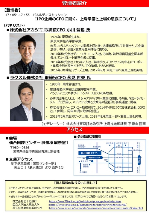 本セミナーでは、東北エリアからの上場企業輩出を目的として、上場企業のIPO実務を経験した経営層より、株式公開の意義や上場企業としての経営をテーマとしたパネルディスカッションが実施される。