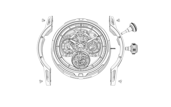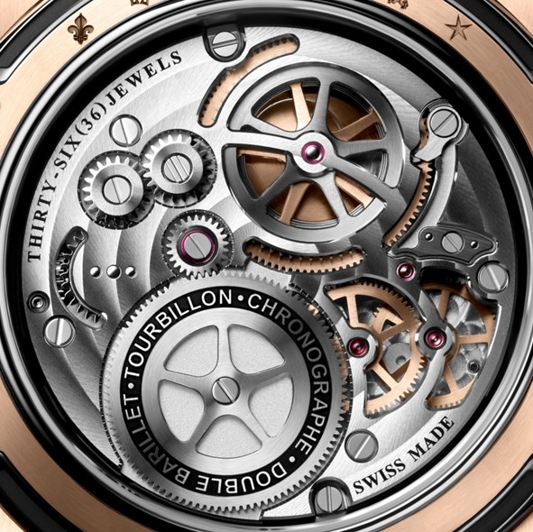 約96時間のパワーリザーブをもたらす独自のツインバレル構造「ボルテフェイス」を採用。片方の香箱の天地をひっくり返すことで、2つの香箱が連動し、クロノグラフとトゥールビヨンを制御するための膨大なエネルギーを供給します。