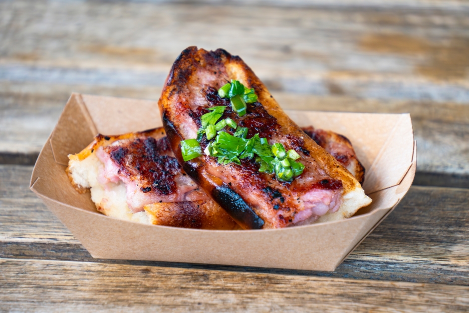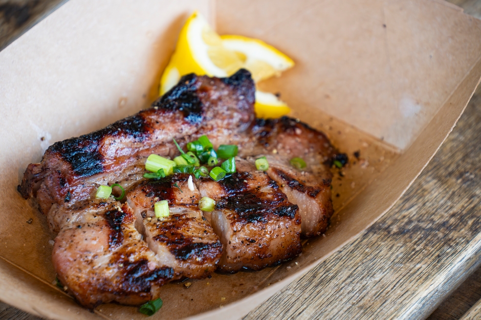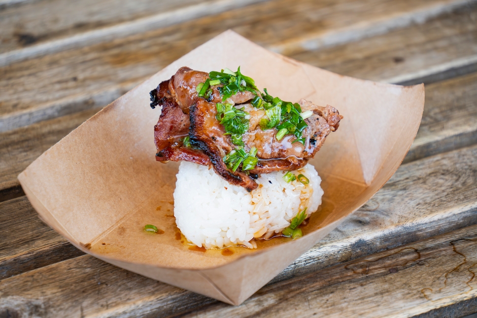 ■農家の大内さんが育てたお米の甘みと分厚く焼いた豚バラの相性は最高のBBQおにぎり: 500円(税込み)