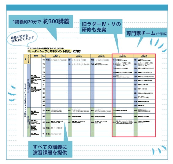 「自施設での研修コンテンツ作成に限界を感じる」「研修とクリニカルラダーがうまく連動しない」という現場の声にお応えして、全国から選ばれた各分野の臨床家や専門家など豊富な講師陣が1講義約20分、約300講義を作成しました。すべての講義に演習テーマも提供しています。